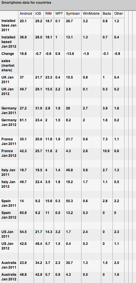 Ma ciò che emerge dall’analisi è senz’altro degno di nota. Il Belpaese sembra avere tutte le carte in regola per divenire una vera e propria “roccaforte” dell’OS ideato da Google, con uno share praticamente del 50% sulla totalità degli smartphone venduti. Se questo dato non vi sorprende, affiancatelo alla crescita a distanza di un anno: nel Gennaio 2011 gli italiani correvano dietro a Nokia ed al suo Symbian (46,8%) e Android era solo a quota 18,7%.